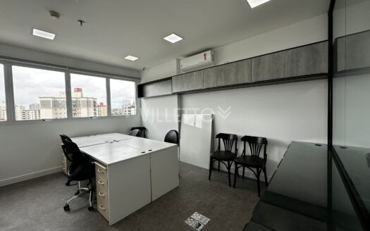 Uma sala compacta e funcional, ideal para profissionais ou pequenas equipes. Além de equipada com estação de trabalho, cadeiras, armário e ar-condicionado, ela ...